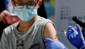 Brendan Lo (13) receives a dose of the Pfizer-BioNTech vaccine for the coronavirus disease (COVID-19) at Northwell Health's Cohen Children's Medical Center in New Hyde Park, New York, U.S., May 13, 2021. REUTERS/Shannon Stapleton